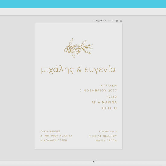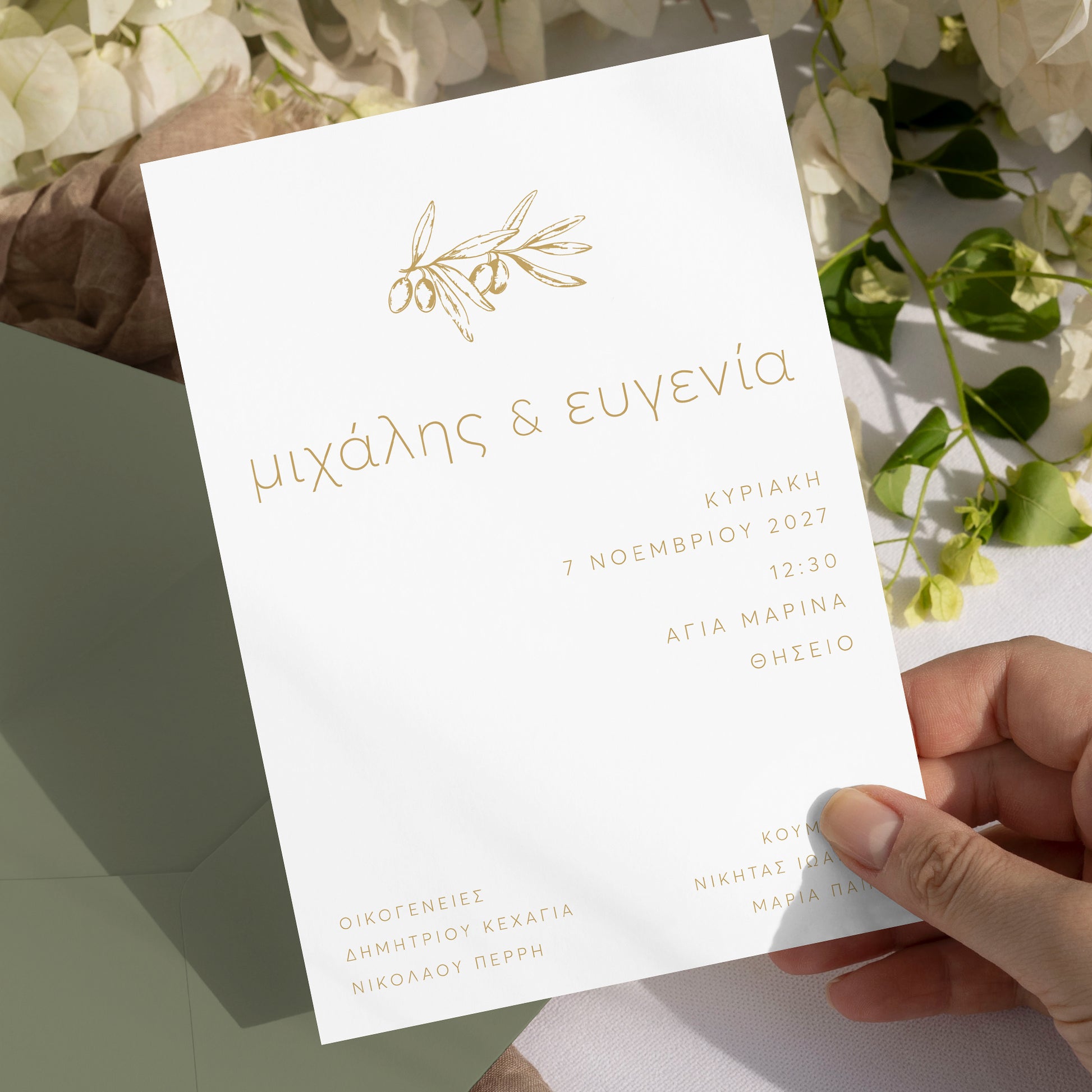 Προσκλητήριο γάμου 15,5Χ22,3 εκ με θέμα την ελιά σε χρυσές αποχρώσεις.